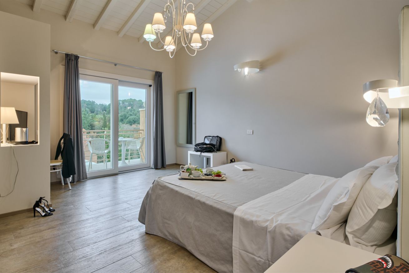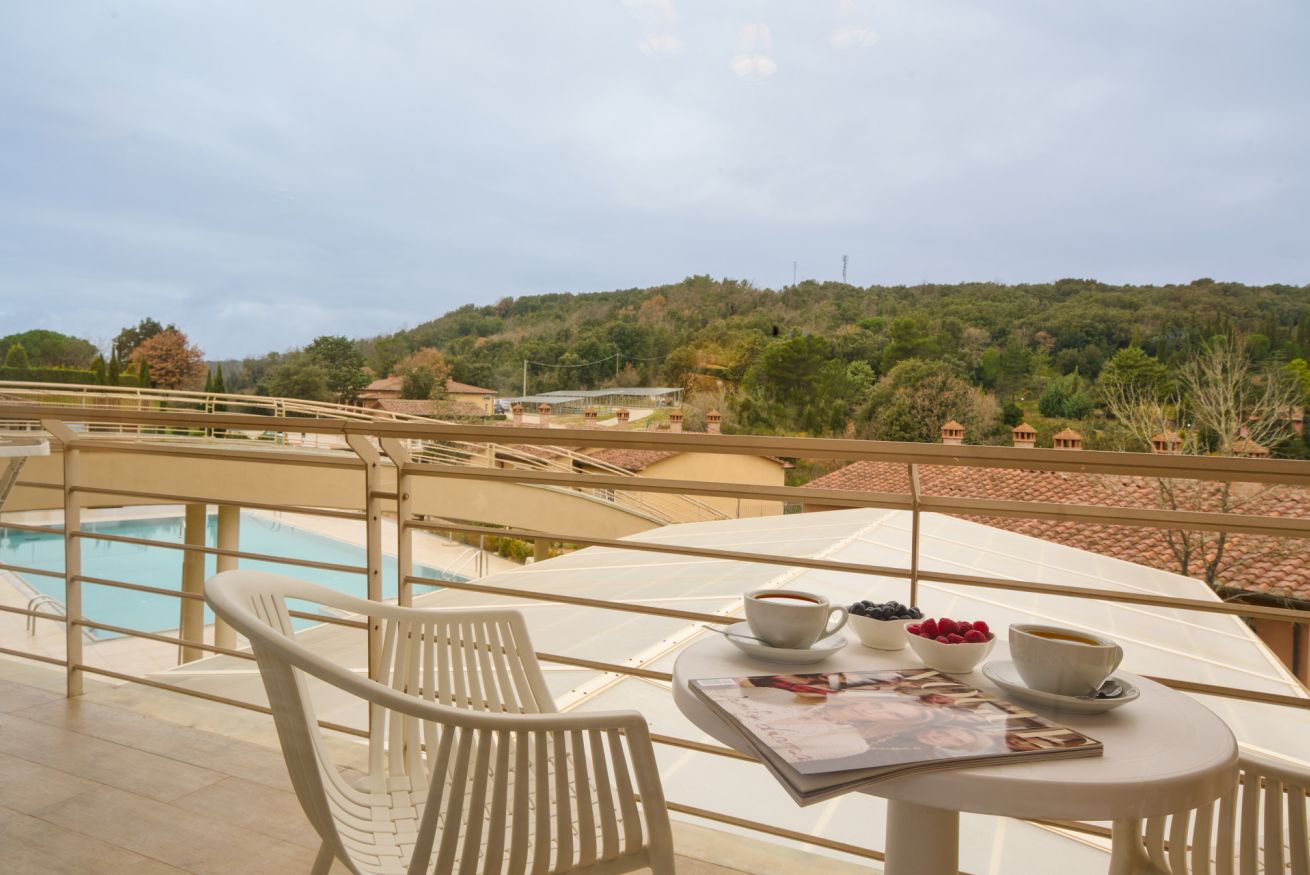 Apprezzerai le nostre camere Deluxe con vista piscina per la vicinanza al centro benessere con piscina interna ed esterna geotermica con acqua calda a 33°, su cui avrai vista anche dal balcone che guarda sulla piscina.