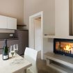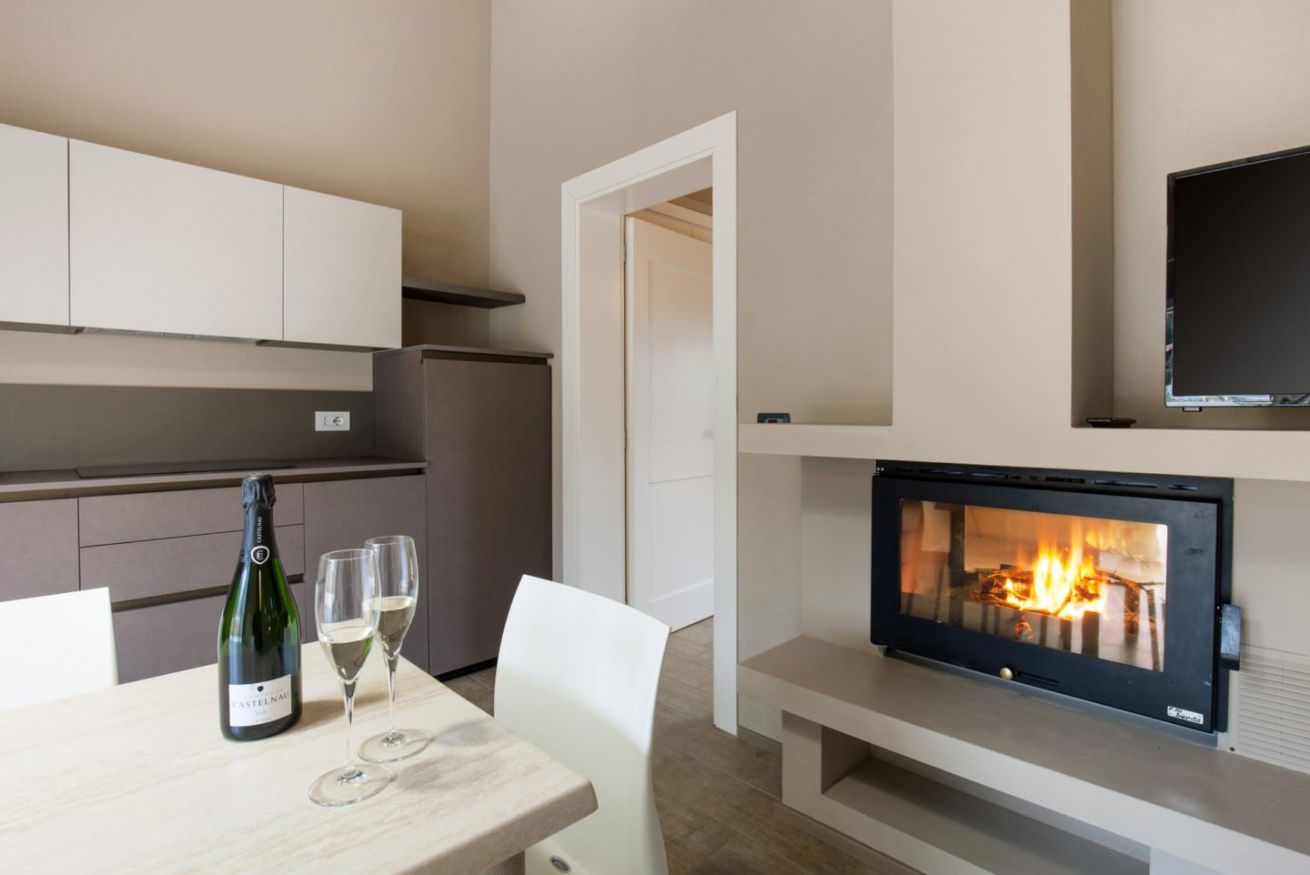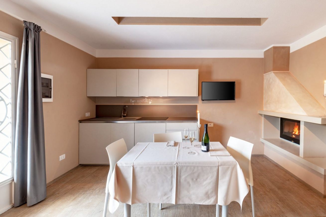 Dal giardino si accede al soggiorno con camino bifacciale, tavolo e sedie; una porta scorrevole separa il soggiorno dalla camera con letto matrimoniale e vasca idromassaggio interna e bagno privato con doccia, toilet e bidet.